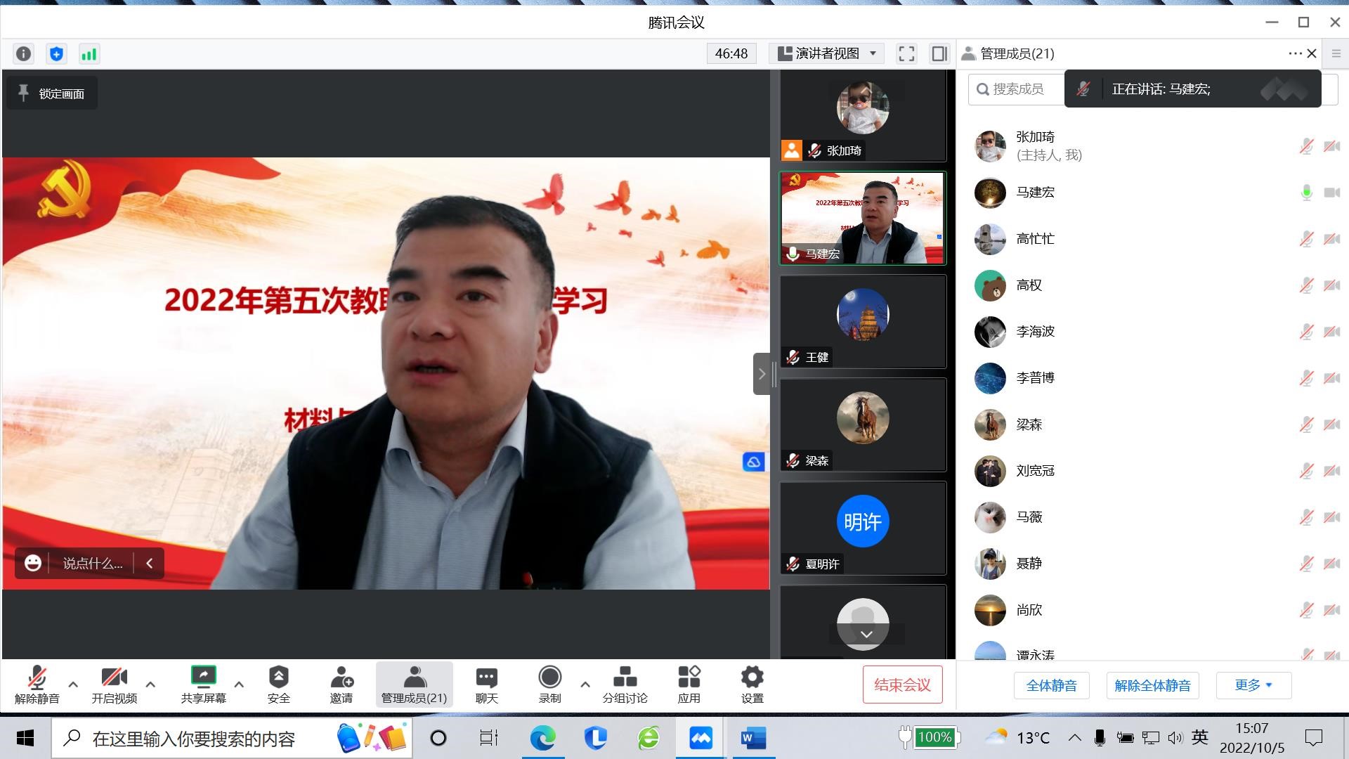 2022年10月5日下午,学院通过腾讯会议形式召开教职工政治理论学习暨直属党支部各党小组会议,教职工政治理论学习由直属党支部书记马建宏同志主持并领学,直属党支部各党小组会议由各小组组长主持,学院全体教职工参加会议。