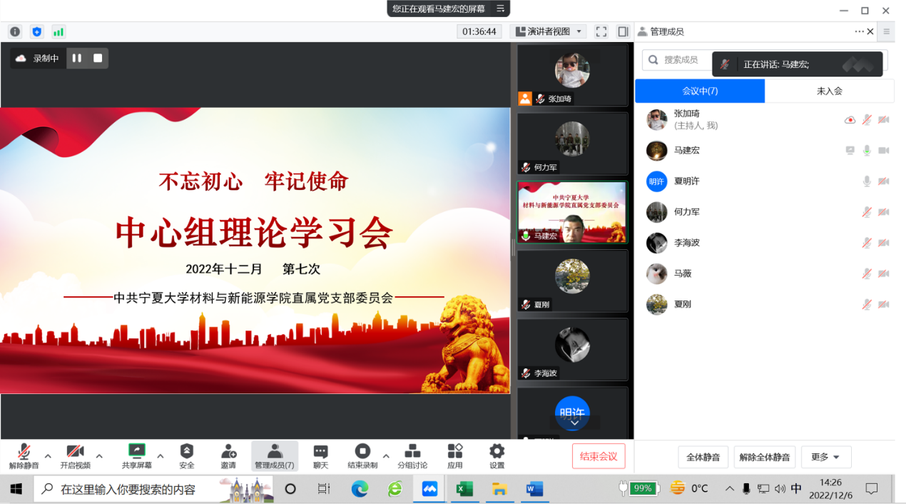 2022年12月6日下午,学院通过线上形式召开直属党支部委员会理论学习中心组(扩大)第七次学习会,学习贯彻党的二十大精神。直属党支部全体委员、各党小组组长、各办公室负责人以及教师代表参加,会议由支部书记马建宏同志主持并领学。