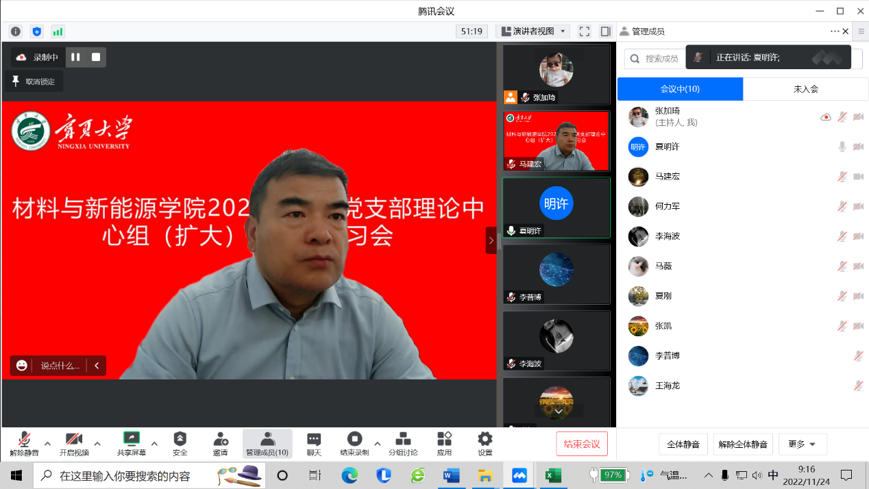2022年11月24日上午,学院通过线上形式召开2022年直属党支部理论中心组(扩大)第六次学习会,直属党支部书记马建宏主持会议,院长夏明许领学,直属党支部委员、各党小组组长、各办公室负责人参加会议。