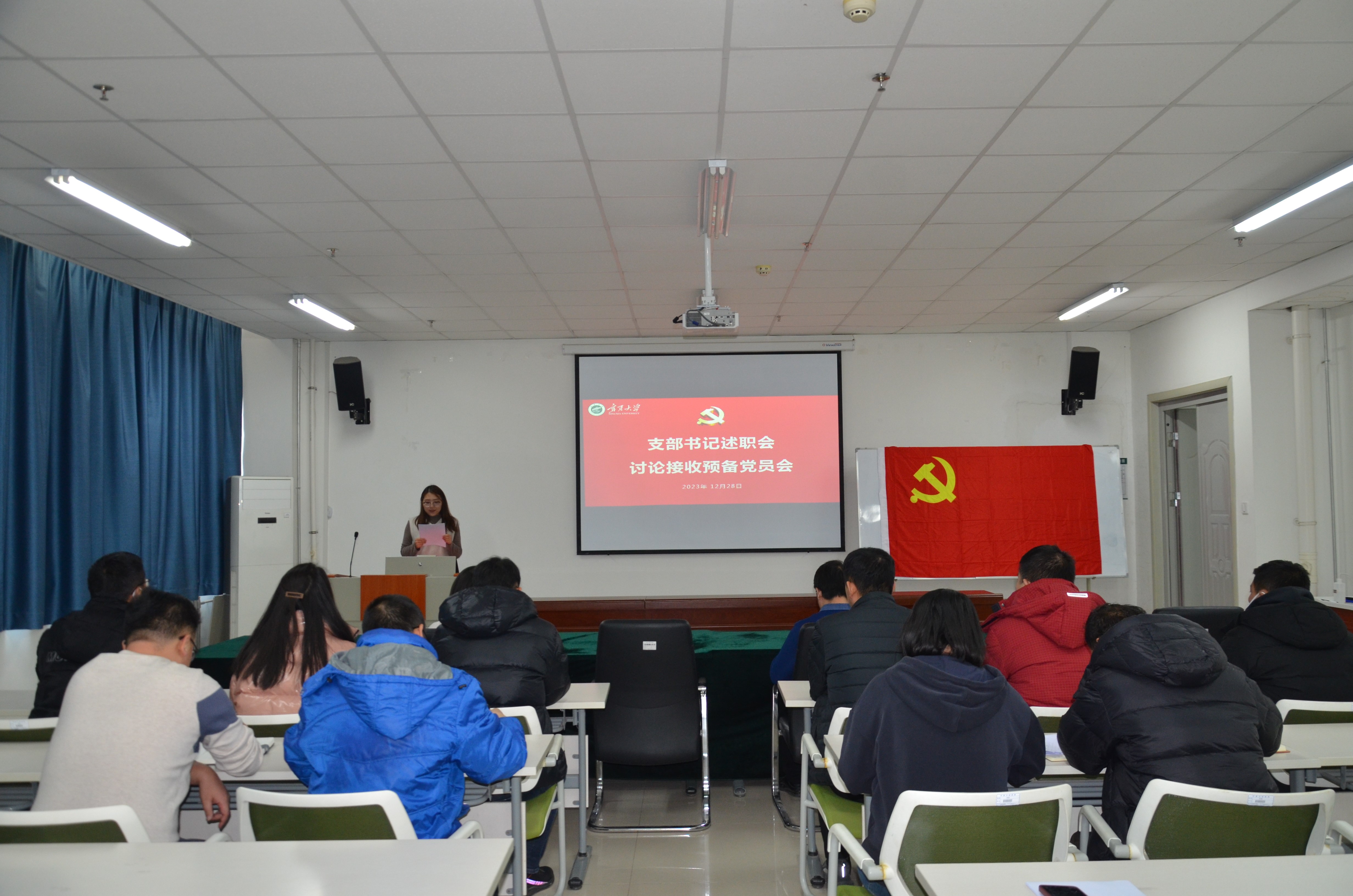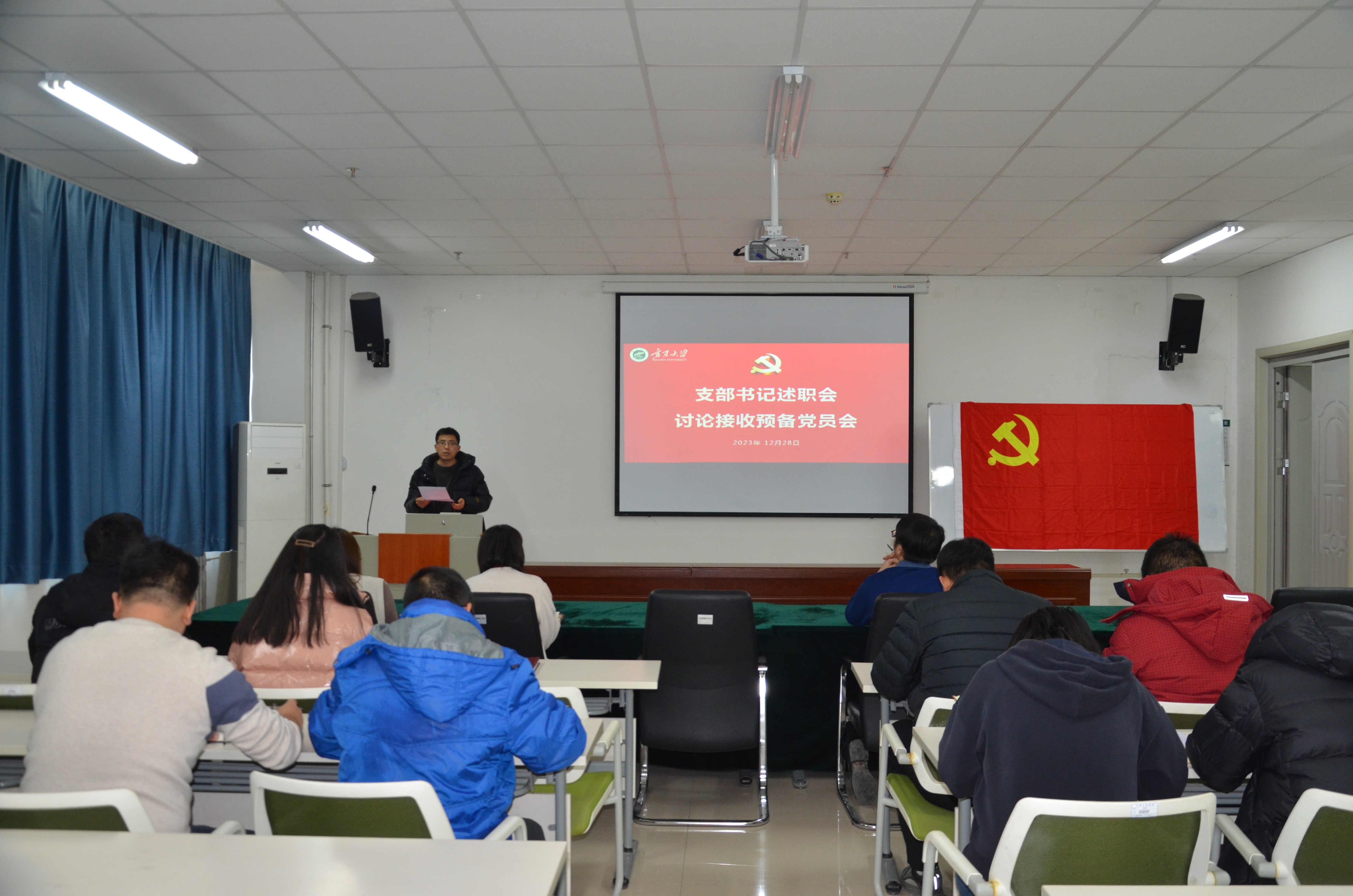 召开2023年度党支部书记述职会和预备党员接收会。党总支书记刘国强同志主持会议,学院全体党员及部分群众代表参加会议。