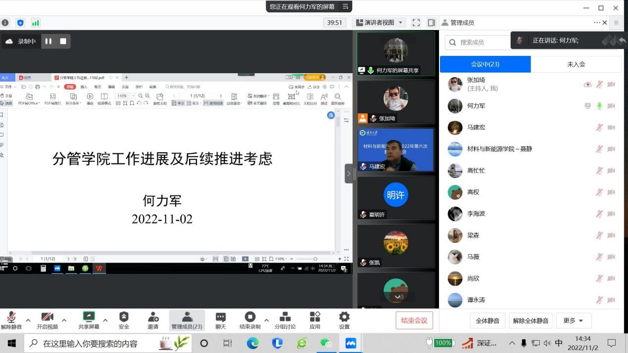 何力军常务副院长汇报了人事工作、宣传工作、基建工作、经费工作、疫情防控等工作情况。
