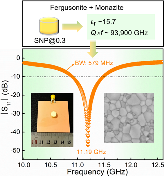 为应对高频通信对介质谐振器天线(DRA)高频高效、高选择性及低延时的挑战,研究团队聚焦SmNbO4体系,采用离子半径较小的P5+(0.38 Å)进行Nb位取代,发现该体系在0.1≤x≤0.4范围内为单斜褐钇铌相和独居石相的复合相,表明P5+离子半径过小,更倾向于形成[PO4]四面体,而非[PO6]八面体。Sm(Nb1-xPx)O4(SNP@x)介电常数()由P5+低离子极化率与低第二相SmPO4的协同作用主导。Q×f值的提升源于双重机制:其一,第二相的形成抑制了微裂纹生成与扩展,阻碍电子迁移并降低漏导损耗;其二,P 2p结合能的增加强化了原子核对外层电子的束缚作用,减少损耗机制,进而提高品质因数。其中,[email protected]陶瓷表现出优异的高频选择性(Q×f=93,900 GHz)。此外,使用超低损耗的[email protected]和罗杰斯基板设计并制作了一个工作在X波段的圆柱形介电谐振器天线(CDRA),在带宽区域(10.903 - 11.482 GHz)内实现了高增益(4.8 - 6.0 dBi)和高效率(> 90%),提升了通信系统中的传输和通信质量。这项工作加速了介电陶瓷和介电谐振器天线在高频通信领域的发展。