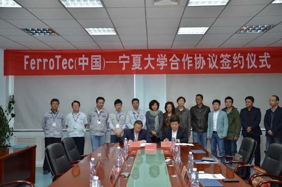 与Ferrotec(中国)合作协议。王春秀副校长、宁夏银和新能源科技有限公司总经理浩育洲参加了签字仪式。出席仪式的还有宁夏光伏材料重点实验室主任李进、副主任何力军、实验室科研骨干及企业方主要部门负责人等。