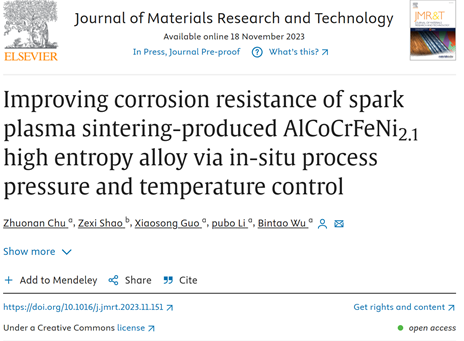 吴斌涛教授课题组在高熵合金研究中取得新进展。团队提出一种简单的方法原位控制AlCoCrFeNi2.1共晶高熵合金FCC与BCC相变含量,从而有效提升了合金的腐蚀性能。相关成果以“Improving corrosion resistance of spark plasma sintering-produced AlCoCrFeNi2.1high entropy alloy via in-situ process pressure and temperature control”为题发表在国际知名期刊《Journal of Materials Research and Technology》(中科院一区TOP),无码动漫