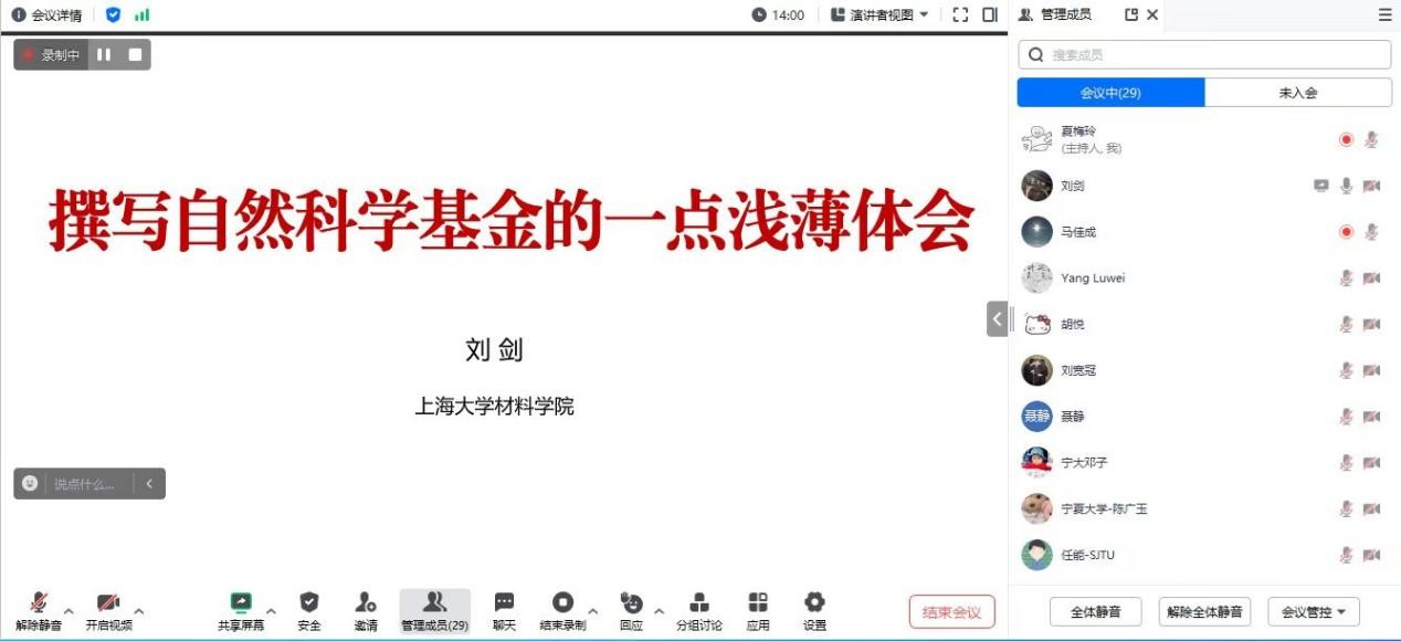 12月20日下午,学院通过线上会议的形式举办了“基金周周讲”系列报告第五期。报告会由副书记兼副院长王海龙主持,上海大学材料学院刘剑教授主讲,学院全体教师参加。