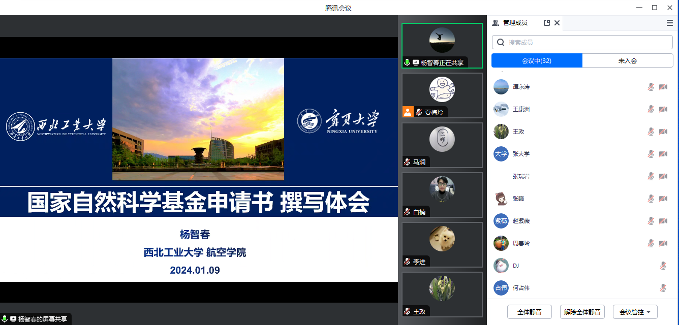 2024年1月9日下午,学院通过线上会议形式举办了“基金周周讲”2024年第一期报告。报告由副院长王政主持,西北工业大学杨智春教授主讲,学院全体教师参加。