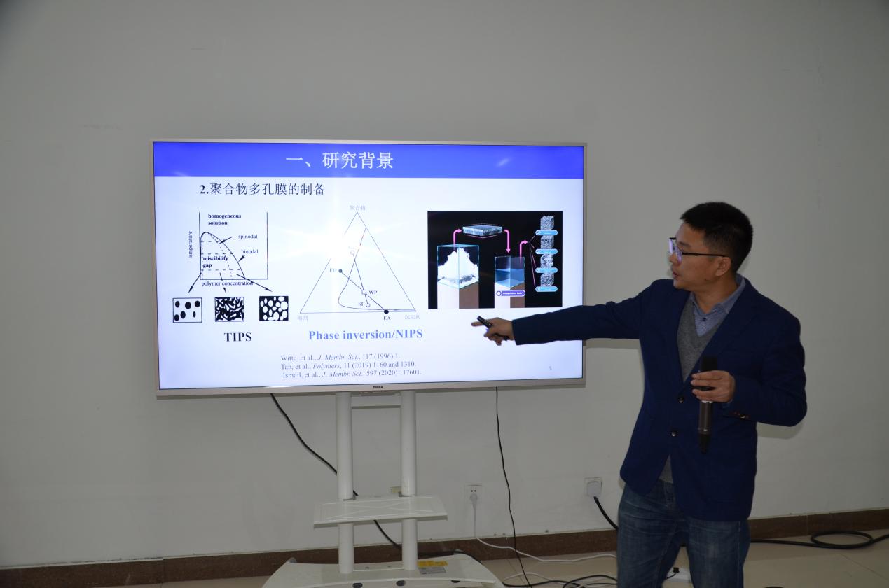 熊晓鹏教授介绍了再生纤维素纳滤膜、超滤膜的制备及其功能化、蒸汽诱导相分离法制备多孔膜材料等内容,并就此同与会师生进行了探讨和交流。