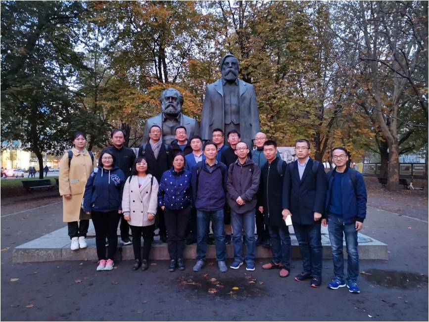 主题教育开展阶段,按照学校党委组织部要求,团队12名党员组成旅德流动党支部,继续开展主题教育活动。到达柏林伊始,团队就来到柏林马恩广场,瞻仰马克思、恩格斯铜像,并认真观看纪念区域内表现无产阶级苦难、觉醒和抗争的艺术浮雕。培训期间,团队又先后凭吊了柏林特雷普托第二次世界大战苏军烈士陵园,参观了柏林墙遗址。在马克思主义的诞生地感受到的共产主义运动和社会主义革命的经验和教训,深化了党员们对“不忘初心、牢记使命”主题的理解和思考。