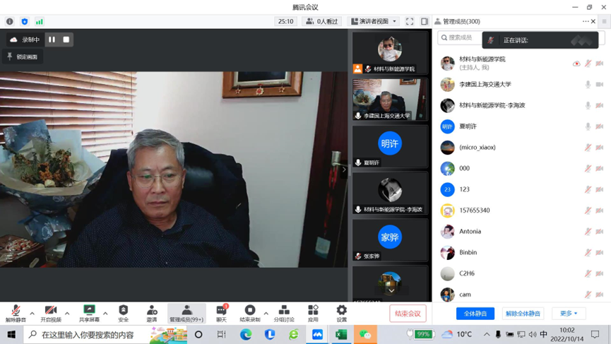 2022年10月14日上午,学院通过线上会议形式举办了“基金周周讲”第二期报告。报告由李海波副院长主持,上海交通大学材料科学与工程学院李建国教授主讲,学院全体教师参加,全国高校相关领域教师共计500余人聆听了报告。
