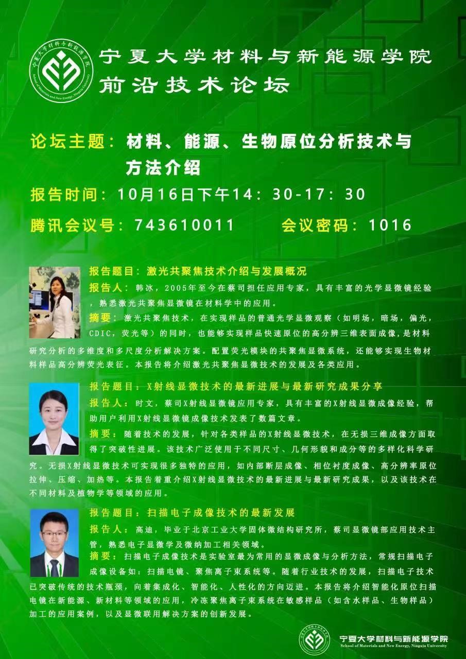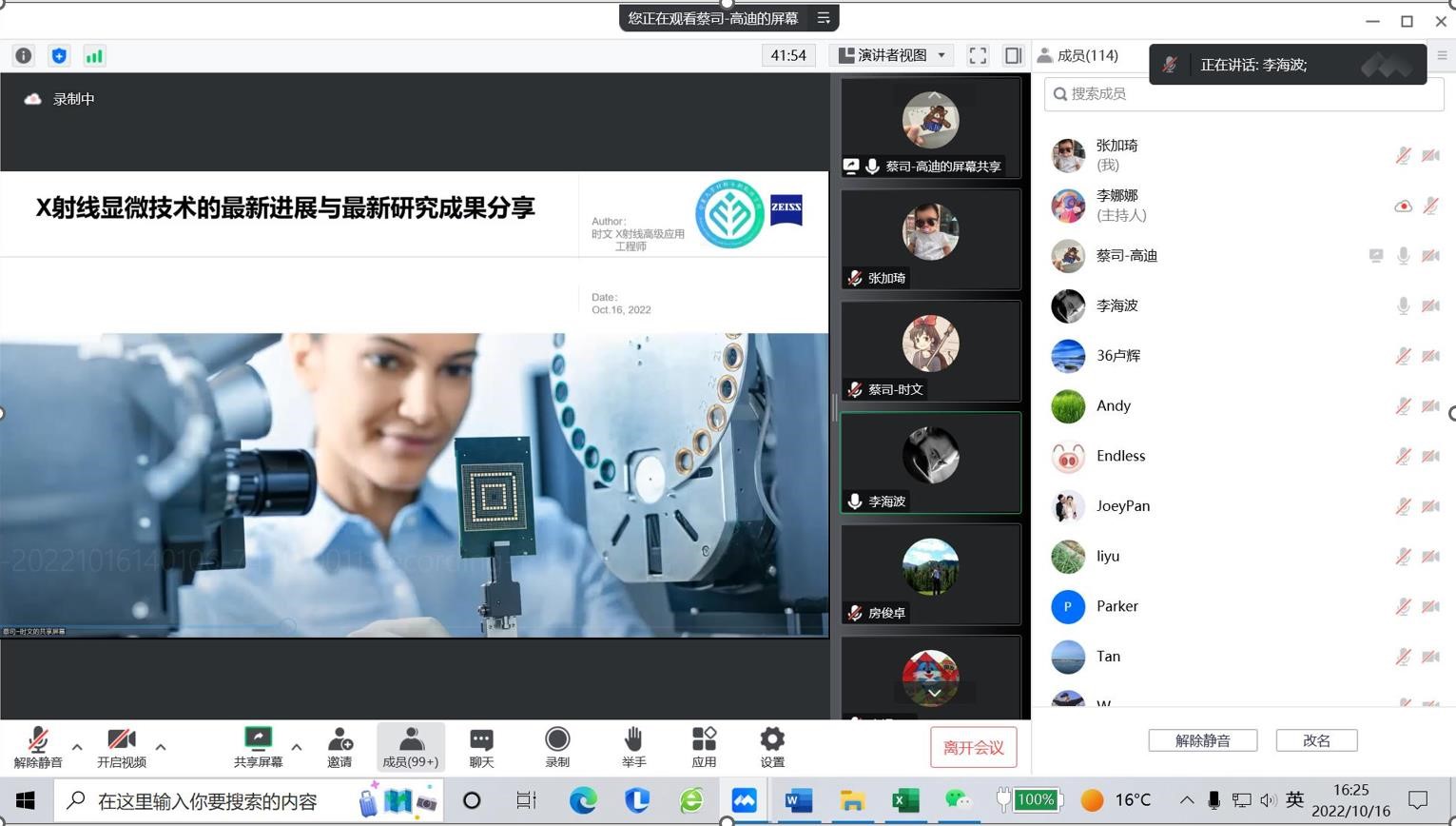 2022年10月16日下午,学院通过线上形式举办了主题为“材料、能源、生物原位分析技术与方法介绍”的“前沿技术”论坛,论坛由李海波副院长主持,蔡司集团显微镜部应用技术主管高迪、应用专家韩冰、时文主讲,学院全体师生参加。报告吸引了全国多所高校相关专业师生。