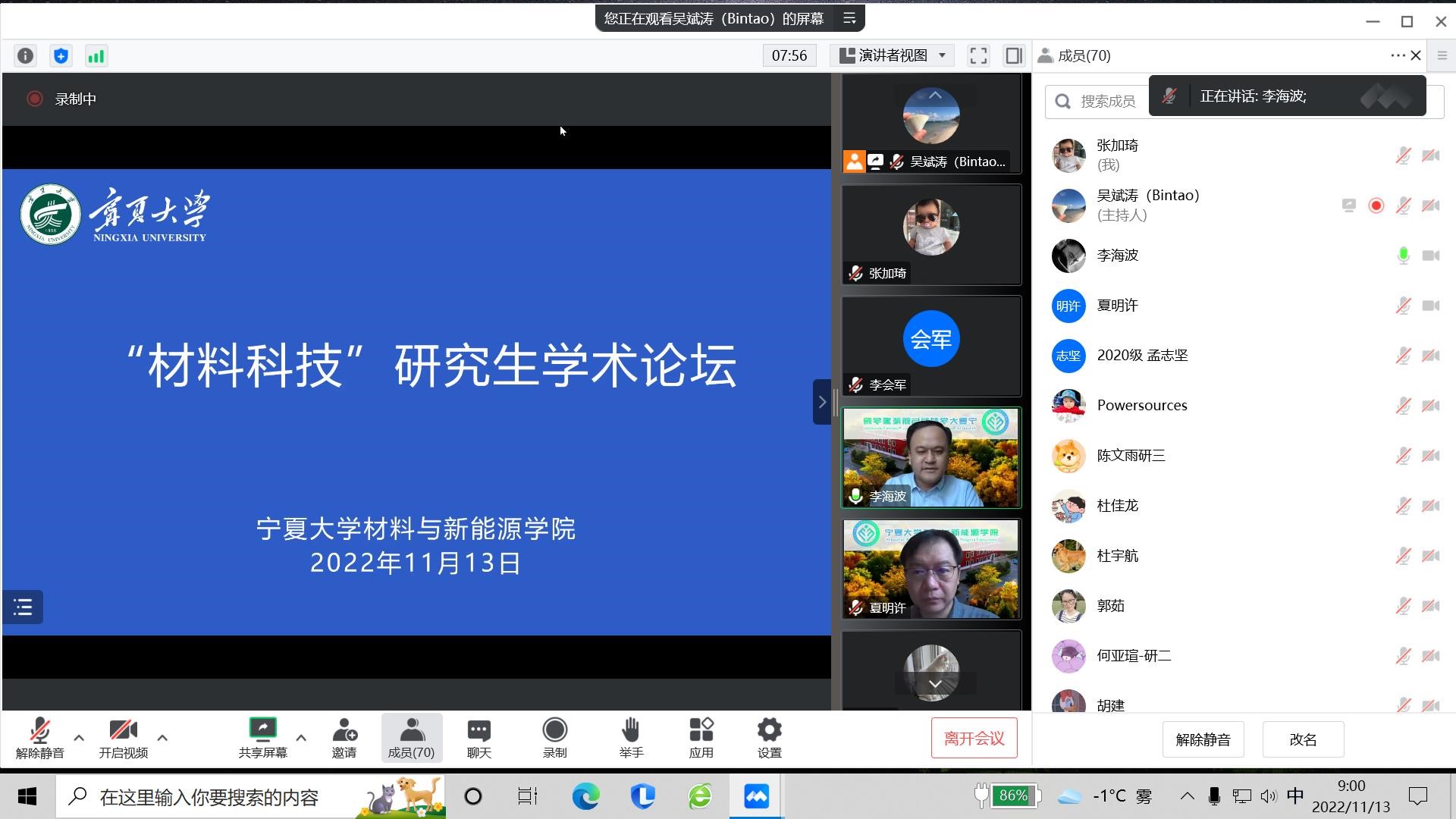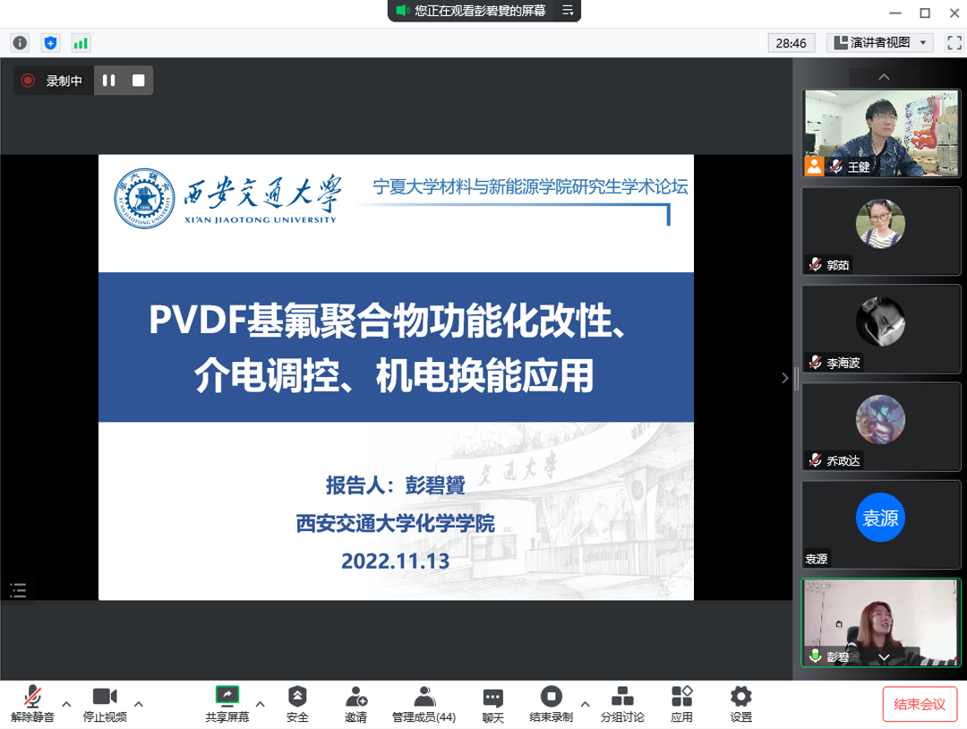 2022年11月13日,学院通过线上形式举办了“材料科技”研究生学术论坛。论坛由李海波副院长主持,澳大利亚伍伦贡大学李会军教授,澳大利亚核科学与技术组织王志阳研究员主讲,学院全体师生参加,来自西安交通大学和北方民族大学材料类专业的研究生也积极参与了本次论坛。