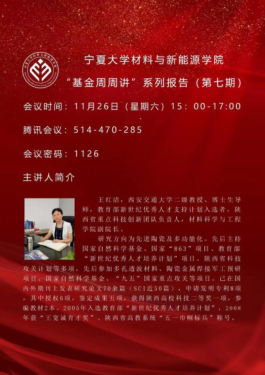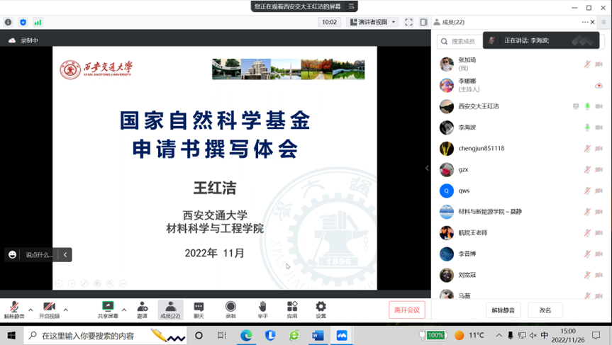 2022年11月26日下午,学院通过线上会议形式举办了“基金周周讲”第七期报告。报告由李海波副院长主持,西安交通大学王红洁教授主讲,学院全体教师参加,学校相关学院教师聆听了报告。