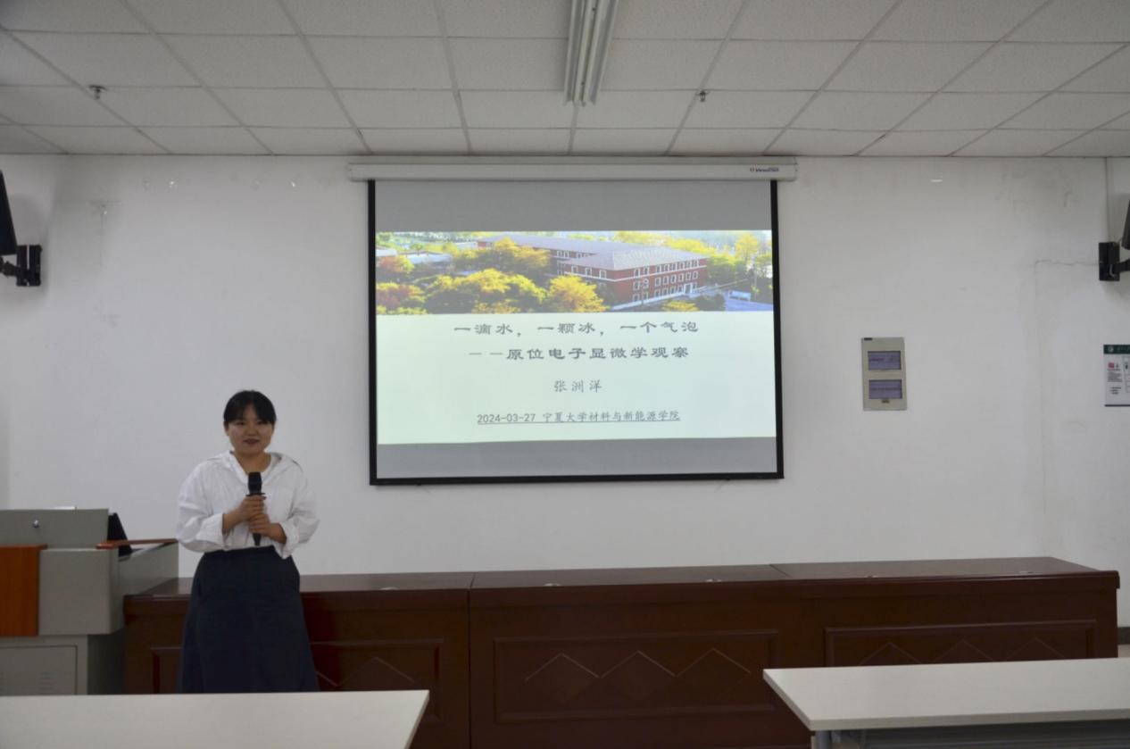 2024年3月27日下午在贺兰山校区科技楼B301会议室,张洲洋博士作了题为“一滴水,一颗冰,一个气泡——原位电子显微镜学观察”的学术报告。这是无码动漫